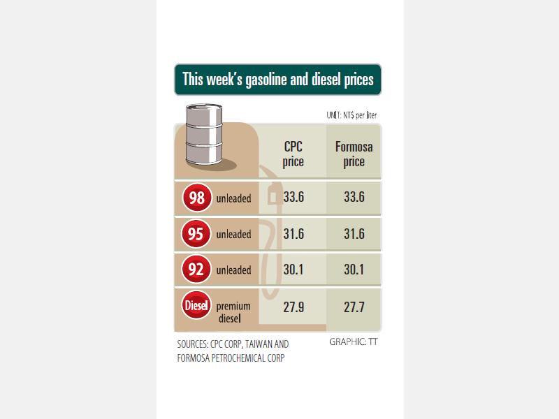 Formosa Petrochemical said that its prices for 92, 95 and 98-octane unleaded gasoline are to drop to NT$30.1, NT$31.6 and NT$33.6 per liter respectively, while the price of premium diesel is to drop to NT$27.7 per liter.