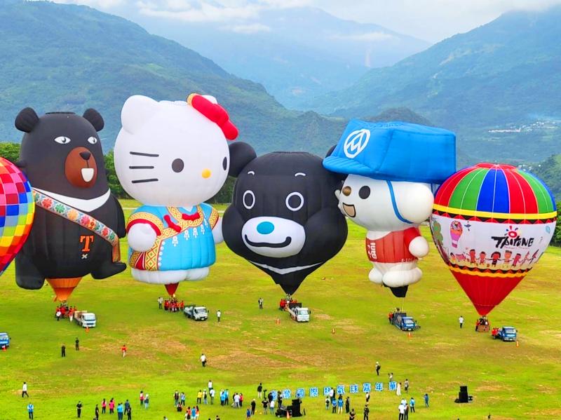 From left, hot air balloons themed on Tourism Bureau mascot OhBear, Japanese cartoon character Hello Kitty, Taipei City Government mascot Bravo and President Chain Store Corp mascot Open are pictured at Luye Highlands in Taitung yesterday. The Taiwan International Balloon Festival this year is to start on July 2 and run until Aug. 15, the Taitung County Government said.