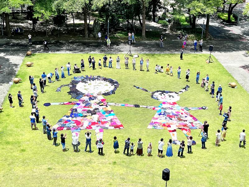 People circle collage art depicting an adult holding a child’s hand in Nantou County’s Caotun Township yesterday. The National Taiwan Craft Research and Development Institute created the work by assembling hundreds of second-hand clothes into the giant parent-child image. It is meant to convey the idea of love and blessings.