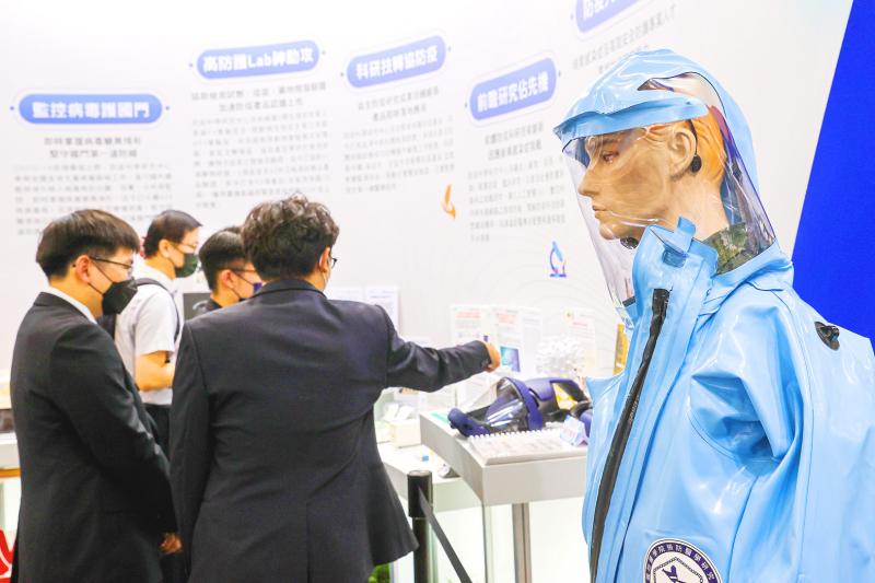 People visit a booth displaying epidemic prevention-related technologies, protective equipment and medical tools at the Taipei Nangang Exhibition Center yesterday. The Bio Asia-Taiwan Exhibition began yesterday and is to run through Sunday. With the theme of Connecting the Asian Value Chain, the event showcases offerings from about 550 companies representing 30 countries.