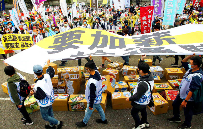 Several labor unions, including the Taiwan Confederation of Trade Unions, the Taiwan Federation of Financial Unions (TFFU), the Taiwan Labor Front (TLF), the Taiwan Women’s Links, and the Taiwan Alliance for Advancement of Youth Rights and Welfare, reiterated their demand that the government raise the minimum wage to NT$28,000 next year, saying that soaring inflation has diminished people’s purchasing power.