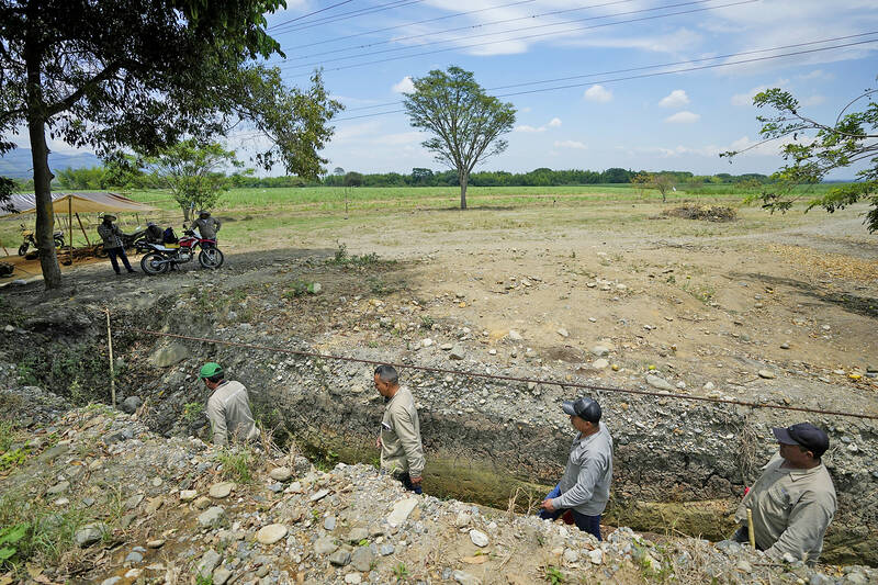 People in Corinto, Colombia, on Thursday walk through a ditch they dug at the entrance of a farm to prevent Indigenous groups from occupying it. Indigenous people in the nation’s southwest in the past few years have invaded thousands of hectares of private farms that they claim as their own, creating conflict between landowners, workers and Afro-descendant communities who also claim the land.