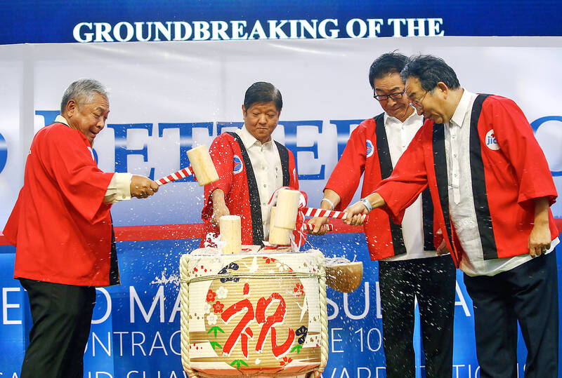 Philippine President Ferdinand Marcos Jr, second left, joins Philippine Secretary of Transportation Jaime Bautista, left, and Japanese Ambassador to the Philippines Kazuhiko Koshikawa, second right, at a ceremonial opening of a sake barrel during the groundbreaking for two underground stations of the Metro Manila Subway Project in Pasig City, Philippines, yesterday. The groundbreaking is part of the construction of a 33km underground railway system aimed at improving the nation’s mass transport infrastructure with support from the Japan International Cooperation Agency.