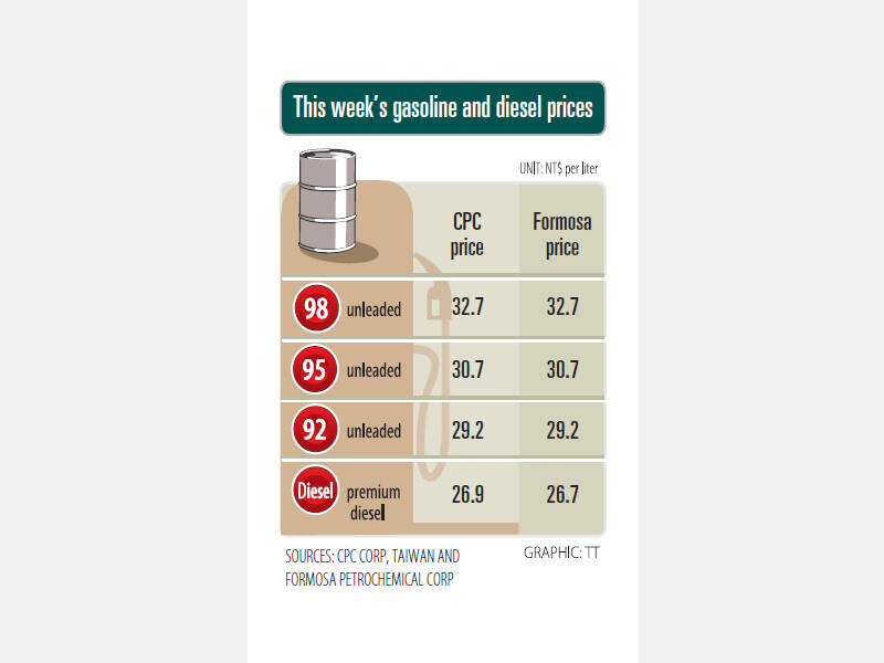 Formosa Petrochemical said its prices for 92, 95 and 98-octane unleaded gasoline are to drop to NT$29.2, NT$30.7 and NT$32.7 per liter respectively, while the price of premium diesel is to cost NT$26.7 per liter.