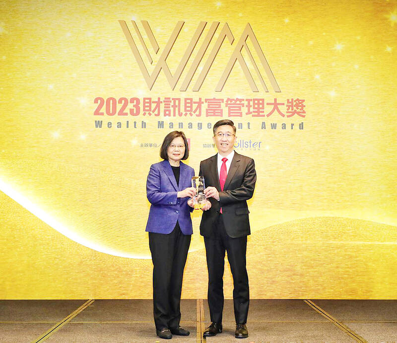 HSBC Taiwan president Adam Chen (陳志堅) attended the awards ceremony yesterday, receiving the trophy for the Best Wealth Management Award from President Tsai Ing-wen (蔡英文).