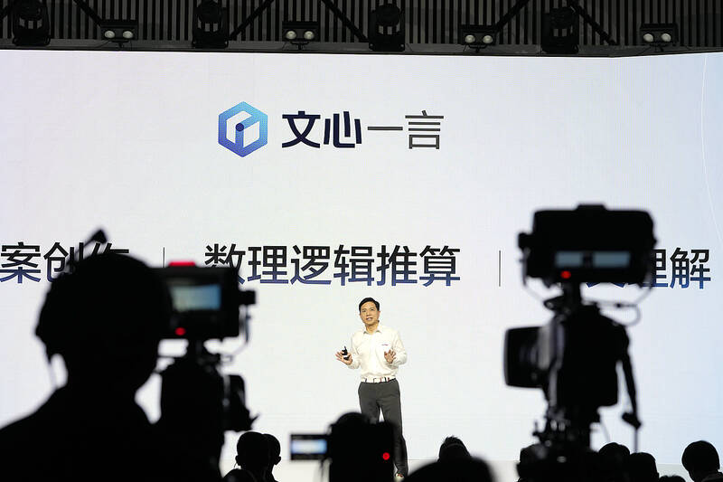 Billionaire founder Robin Li (李彥宏) took to a Beijing stage to introduce his company’s Ernie Bot, a landmark moment for a search leader that has struggled in recent years to revitalize growth.