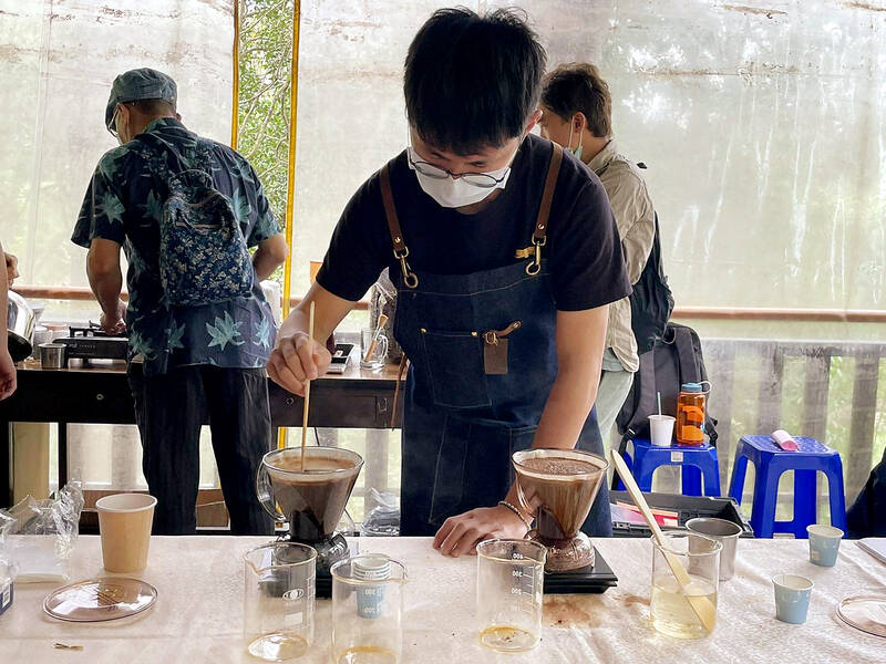 A man makes coffee during a news conference yesterday to promote the Guansi Coffee Festival in Hsinchu County’s Guansi Township. The festival is to start tomorrow.