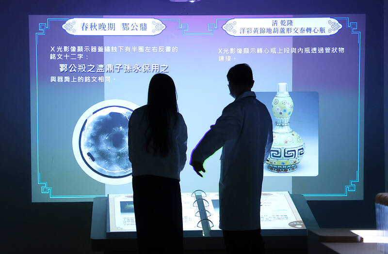 People are silhouetted against a display at the “Investigation and Restoration of Cultural Relics” exhibition at the National Palace Museum in Taipei yesterday. The exhibition is divided into three sections — “Technical Analysis of Antiquities,” “Restoration of Porcelain” and “Restoration of Calligraphy and Paintings” — that allow visitors to learn about the museum’s conservation techniques. The exhibition runs through June 10.