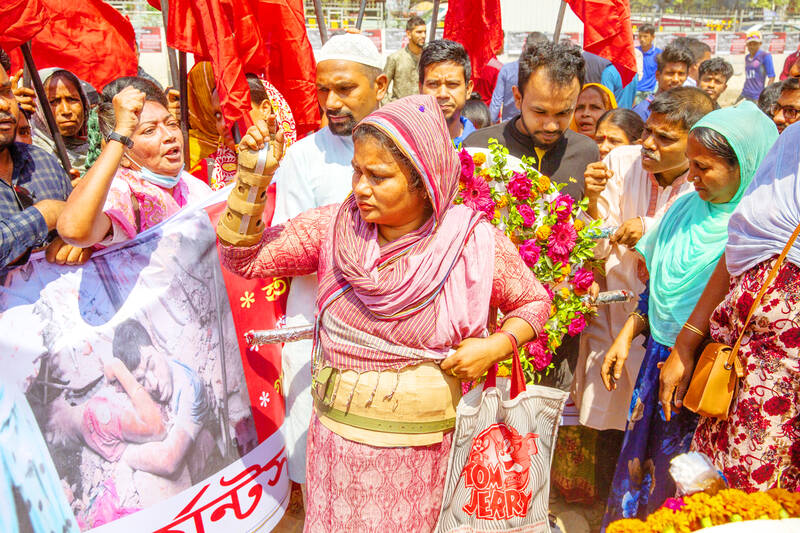 Members of a labor rights organization yesterday hold a rally to pay tribute to deceased workers at the site where the Rana Plaza garment factory collapsed, on the outskirts of Dhaka, Bangladesh, marking the 10th anniversary of the disaster. Several garment manufacturer organizations and family members attended the rally at the site where 1,134 people died and about 2,500 were injured.