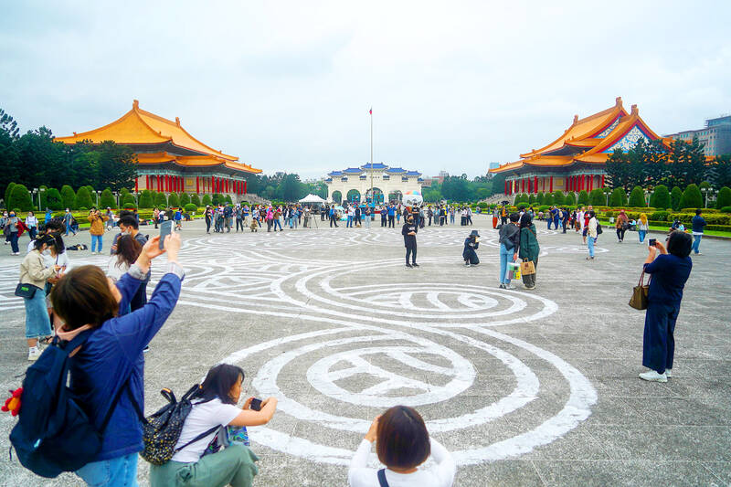 People take pictures of arabesques drawn on the ground by French street artist Jordane Saget at the Chiang Kai-shek Memorial Hall plaza in Taipei yesterday. The Paris-based street artist began his five-hour outdoor creation at 9am yesterday as part of a flash exhibition. The chalk drawings were washed away overnight.