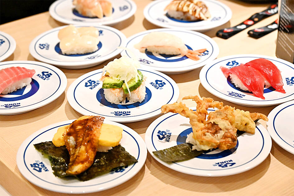 Japanese revolving sushi bar restaurant chain Kura Sushi yesterday opened its first overseas flagship restaurant in Kaohsiung. It is also the chain’s 51st outlet in Taiwan.