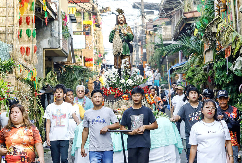 Devotees take an image of San Isidro Labrador on a street procession to celebrate the Pahiyas Festival in Lucban, Philippines, yesterday. The Pahiyas Festival is celebrated annually in Quezon Province to honor San Isidro Labrador, the patron saint of farmers. Agricultural products are displayed at the facades of houses to express gratitude for a good harvest with hopes of more years of prosperity ahead.