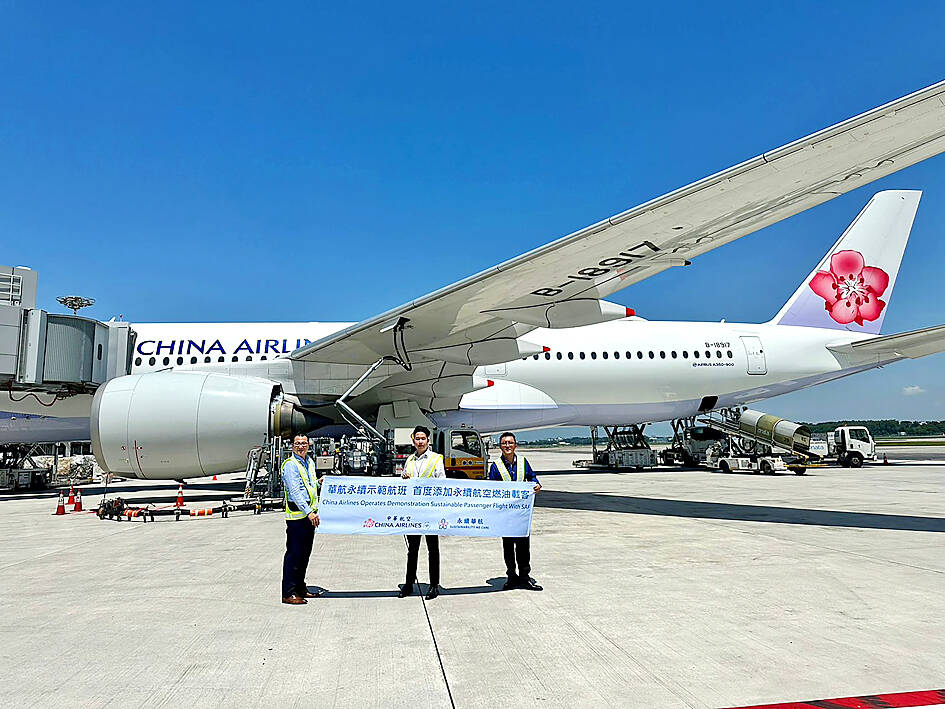 China Airlines Ltd (CAL, 中華航空) yesterday launched its first passenger flight from Taipei to Singapore using sustainable aviation fuel, as the carrier aims to reduce carbon emissions despite higher costs.