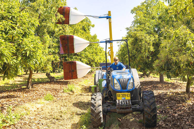 At an avocado orchard in a kibbutz in central Israel, a tractor slowly pulls a device through the trees.