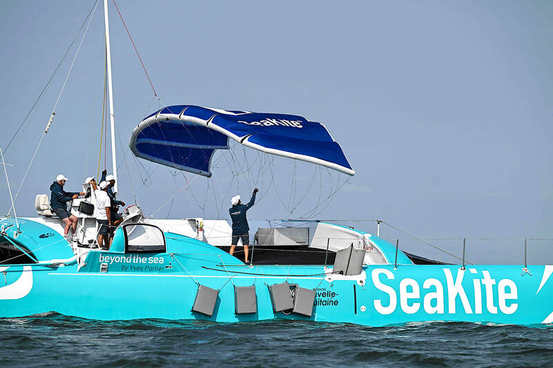 In Arcachon Bay in southwest France, the start-up Beyond The Sea tested a blue inflatable kite sail the size of a small studio to pull a specially designed catamaran across the water.