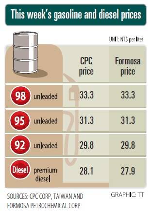 Gasoline prices at CPC and Formosa stations are today to increase to NT$29.8, NT$31.3 and NT$33.3 per liter for 92, 95 and 98-octane unleaded gasoline respectively, the companies said. The price of premium diesel is to rise to NT$28.1 at CPC stations, and NT$27.9 at Formosa pumps.