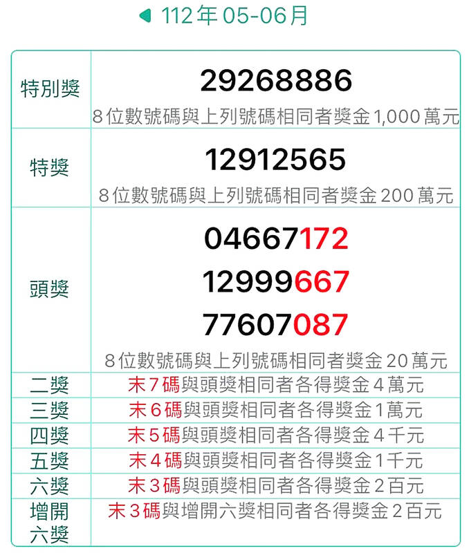 In addition to the two most coveted prizes, the three numbers for the NT$200,000 first prize were 04667172, 12999667, and 77607087.
