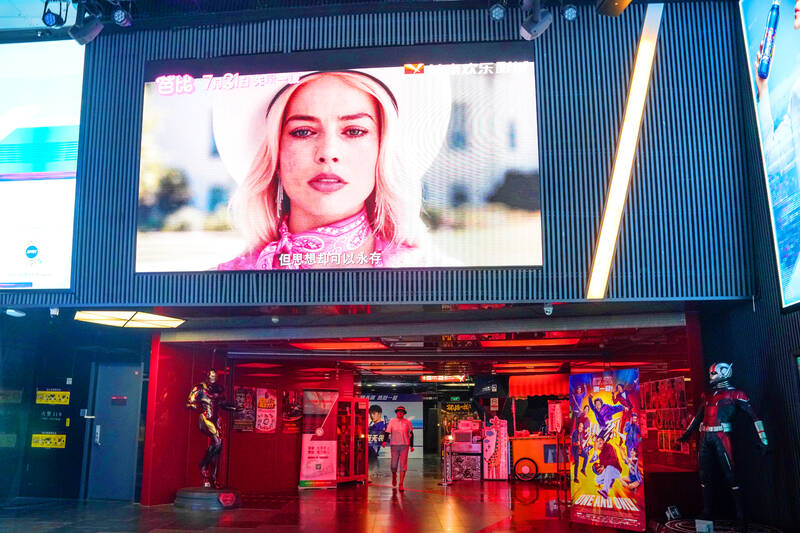 The “Barbie” movie trailer is displayed on a screen at a cinema in Beijing yesterday. The movie starring Margot Robbie was released on July 21 in China and soon became popular among youngsters. The global box office of the movie has exceeded US$1 billion and 228 million yuan (US$31.7 million) at the domestic box office in China.