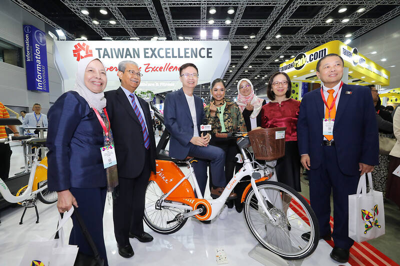 Taiwan External Trade Development Council (TAITRA) chairman James Huang, third left, Representative to Malaysia Phoebe Yeh, second right, and other guests pose with an electric YouBike at the Kuala Lumpur Convention Center on the first day of the Taiwan Expo yesterday. The three-day trade show is organized by the Bureau of Foreign Trade and TAITRA, with 170 Taiwanese exhibitors showcasing a diverse range of products and services related to the circular economy, halal-certified products, smart medicine, intelligent lifestyle and industry 4.0.