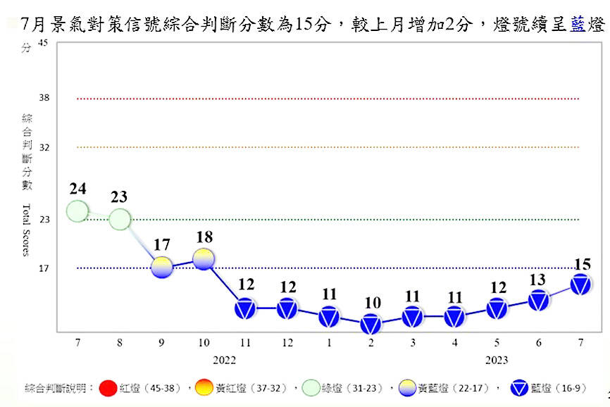 Overall, the monitor, which is made up of nine components, rose from 13 in June to 15 last month, while the index of leading indicators declined less than it had a month earlier, giving the council more confidence that a recovery could be expected, council deputy economic researcher Chiu Chiu-ying (邱秋瑩) told a media briefing.