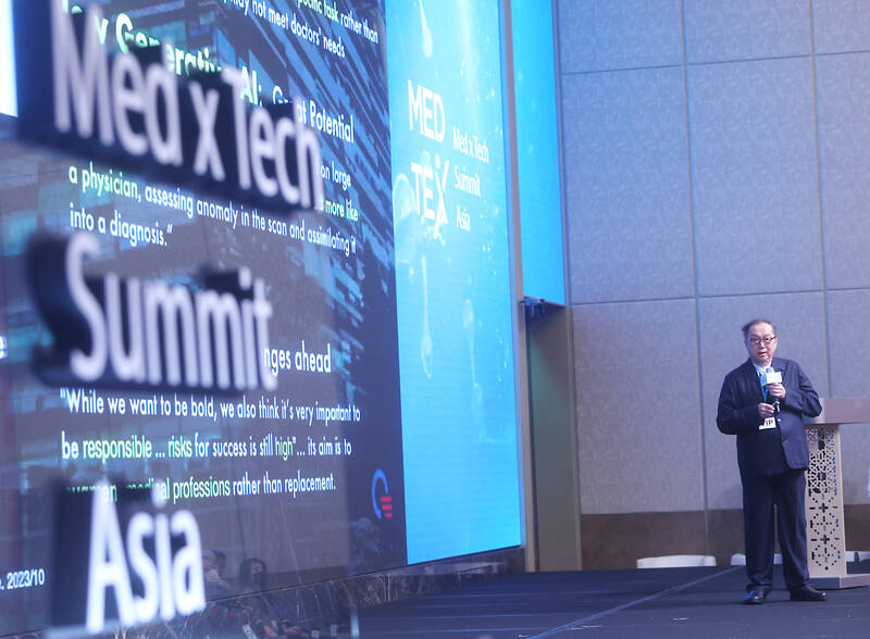 Addressing the MEDTEX Summit Asia in Taipei yesterday, Quanta Computer Inc chairman Barry Lam speaks about the role of artificial intelligence (AI) in the medical industry and what breakthrough technologies and new applications AI will bring to medical treatment. The MEDTEX summit coincides with the Taiwan Healthcare Expo, which runs until Sunday at the Taipei Nangang Exhibition Center’s Hall 1. This year’s event features 2,300 booths from 650 exhibitors and is expected to attract about 2,000 international buyers, organizers said yesterday.