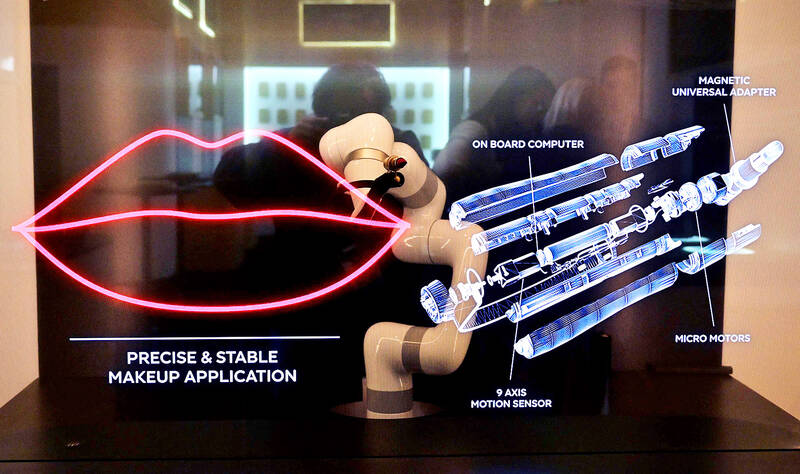 The HAPTA makeup applicator from Lancome, part of the L’Oreal Luxury Products division, demonstrates its precise computerized makeup applicator, powered by artificial intelligence learning sensors for people with limited mobility to apply lipstick easily and evenly, is displayed at the Consumer Electronics Show in Las Vegas, Nevada, on Sunday. With perfect manicures at home and personalized advice on skin care and makeup thanks to artificial intelligence, the beauty industry is taking advantage of technological innovations with the aim of democratizing services sometimes reserved for the more affluent.