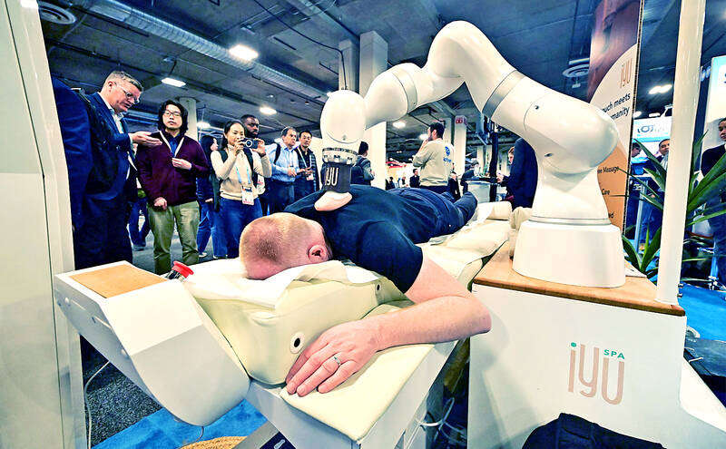 A man experiences an iYU Spa massage from Capsix Robotics, an AI assisted massage therapy device at the Consumer Electronics Show in Las Vegas, yesterday. The iYU Spa massage from Capsix Robotics is an AI assisted massage therapy device that is fully customizable and attentive to the users preferences.