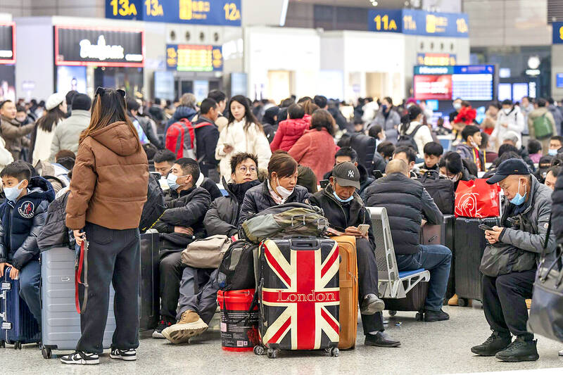Travelers crowd the Shanghai Hongqiao Railway Station ahead of the Lunar New Year holiday yesterday. China is gearing up for a record number of trips during the Lunar New Year and has vowed efforts to ensure safety as hundreds of millions of people take to the skies, roads and rail.