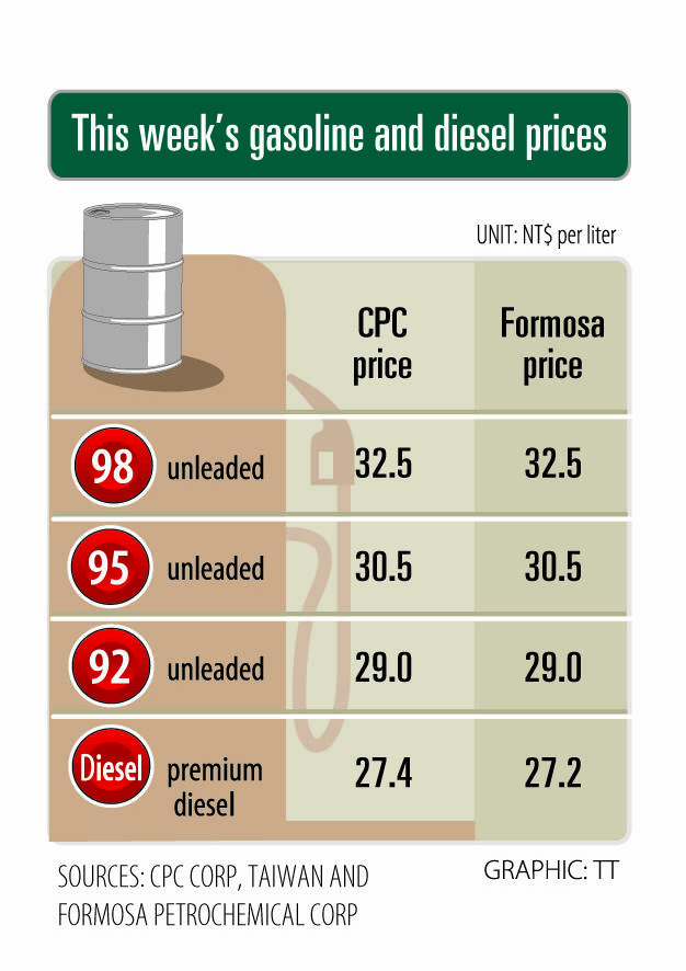 The price of premium diesel is to be NT$27.4 at CPC stations and NT$27.2 at Formosa pumps, they said.