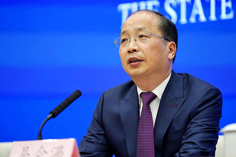 State broadcaster CCTV yesterday said the top leadership of the Chinese Communist Party removed Yi Huiman (易會滿) from his position as chief of China’s Securities Regulatory Commission (CSRC), the country’s top financial regulator.