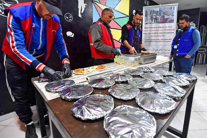 The Friday night meal is from the kitchen of the “Restaurant of Love,” a charitable initiative launched by Universelle three years ago to help feed the growing number of Tunis’ homeless.