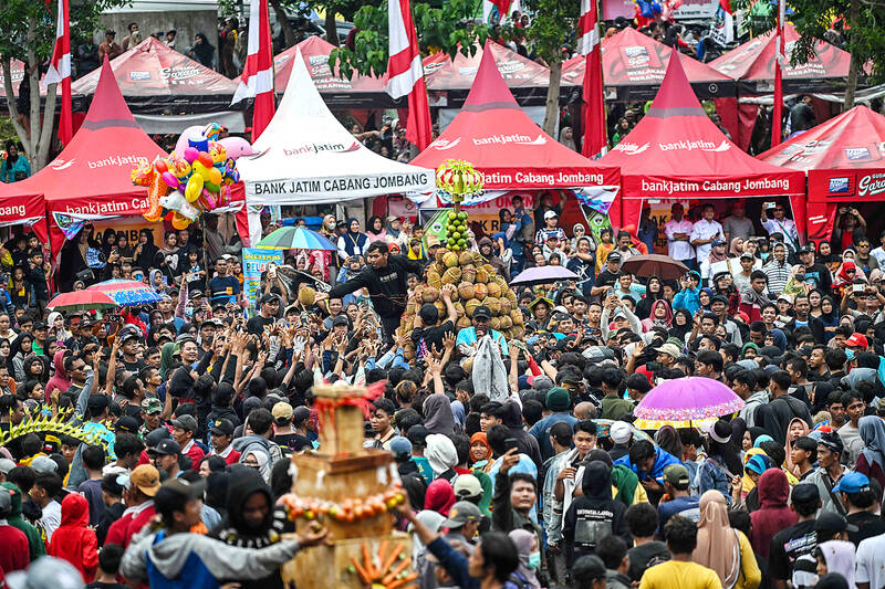 People reach out to claim free durians during a durian festival in the Indonesian village of Wonosalam in Java’s Jombang Regency yesterday. Grown across tropical Southeast Asia, the durian is hailed as the “king of fruits” by its fans, who liken its creamy texture and intense aroma to blue cheese. Many detractors compare its smell to sewage or sweaty socks.