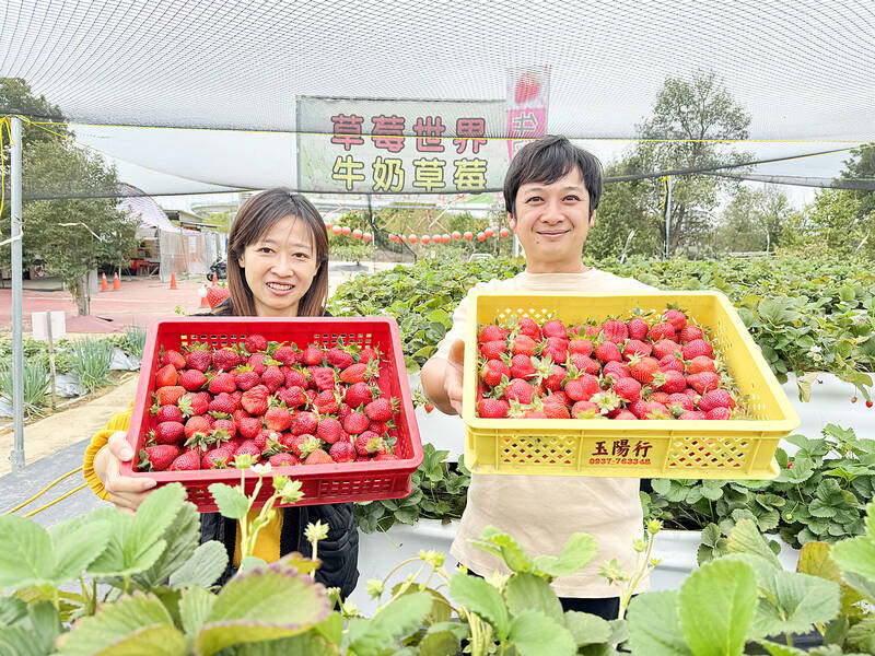 Farmers at Strawberry World — one of the bigger strawberry farms in central Taiwan — display their fruit in Taichung’s Tanzih District yesterday. Due to the larger difference between day and night temperatures in Tanzih, strawberry season in the area is longer than farms elsewhere and tourists can pick strawberries until April 7, local farmers said.
