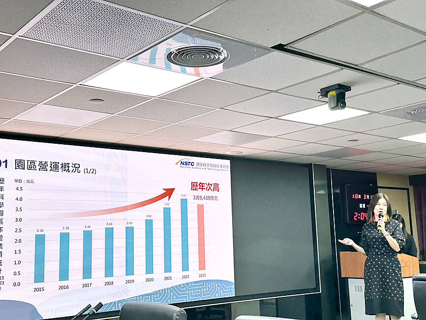 The three science parks — Hsinchu Science Park (新竹科學園區), Central Taiwan Science Park (中部科學園區) and Southern Taiwan Science Park (南部科學園區) — posted a 7.56 percent annual decline in revenue to NT$3.94 trillion (US$125.42 billion) last year, from NT$4.26 trillion in 2022, which was an all-time high, council data showed.