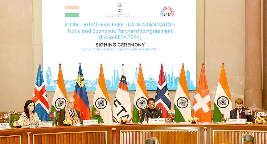 The agreement was signed in New Delhi by Goyal, Swiss Department of Economic Affairs head Guy Parmelin, Iceland Minister of Foreign Affairs Bjarni Benediktsson, Liechtenstein Minister of Foreign Affairs Dominique Hasler and Norwegian Minister of Trade and Industry Jan Christian Vestre.