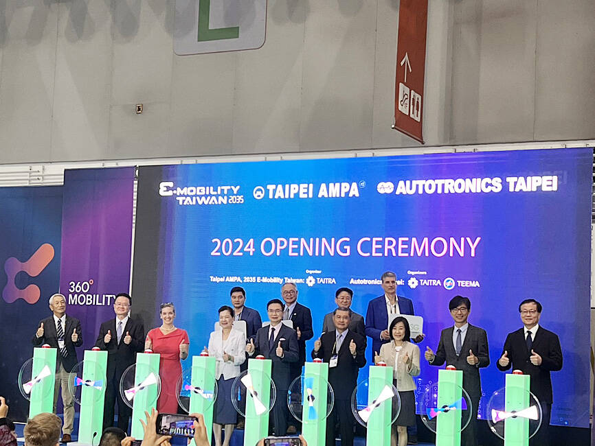 The Taipei International Auto Parts and Accessories Show (Taipei AMPA), the Taipei International Automobile Electronics Show (Autotronics Taipei) and the 2035 E-Mobility Taiwan exhibition jointly opened yesterday at the Taipei Nangang Exhibition Center’s Hall 1, featuring electric vehicles along with components and assemblies.