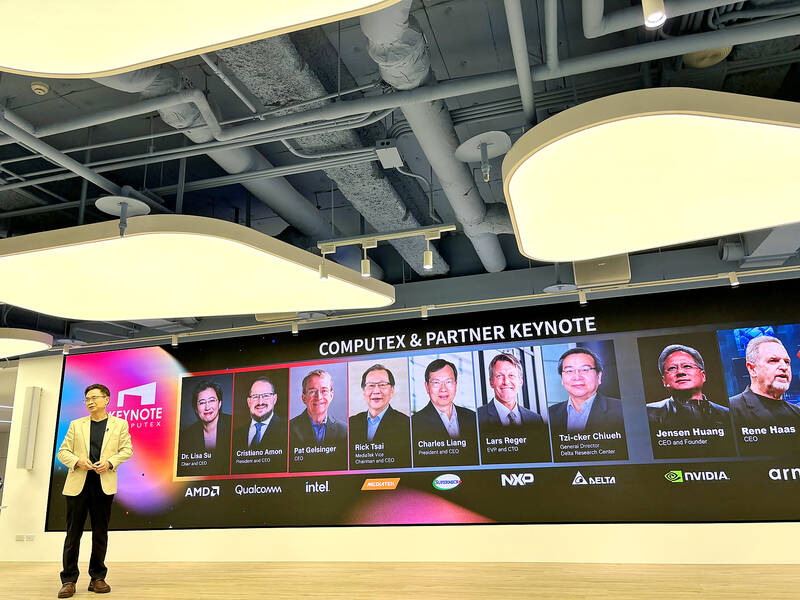 Taiwan External Trade Development Council chairman James Huang speaks at a news conference for this year’s Computex trade show in Taipei yesterday. Nine technology CEOs are to attend this year’s Computex at Taipei Nangang Exhibition Center from Tuesday to Friday next week, Huang said. The event is also to feature keynote speeches by CEOs including Advanced Micro Devices Inc’s Lisa Su, MediaTek Inc’s Rick Tsai, Qualcomm Inc’s Cristiano Amon, Intel Corp’s Pat Gelsinger and Super Micro Computer Inc’s Charles Liang, he said.