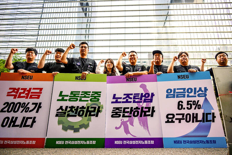Union leaders gathered yesterday in front of Samsung’s office building in Seoul, with one speaking to a local television station. A bus draped in an enormous white protest banner was parked at the site. Placards carried worker appeals, but the crowd was largely muted.