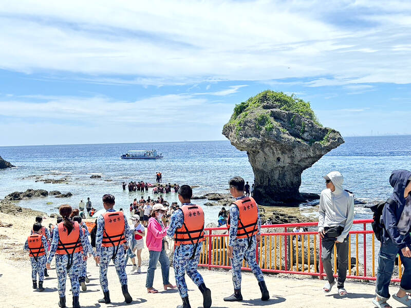 People walk toward Siaoliouciou Island’s Flower Vase rock formation yesterday. The Pingtung County Government plans to implement several new conservation measures due to an increasing number of tourists to the island, including an environmental protection fee of NT$60 per person to gain access to three intertidal zones of Shanfu, Yucheng Wei and Duozaiping, from July 1.