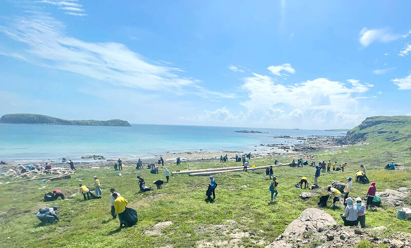 Volunteers clean up a beach near Sanci Harbor in Penghu County’s Wangan Township yesterday, collecting about 2.2 tonnes of garbage, as the Penghu National Scenic Area Administration promotes rehabilitating and restoring corals in the area.