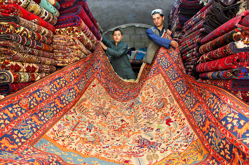Vendors display carpets at a shop in Kandahar, Afghanistan, on Wednesday. During the first five months of this year, Afghanistan exported more than 2 million kilograms of carpets worth US$7.5 million to nations including Pakistan, Uzbekistan and several European states, Afghan Ministry of Industry and Commerce spokesman Akhundzada Abdul Salam Jawad said.