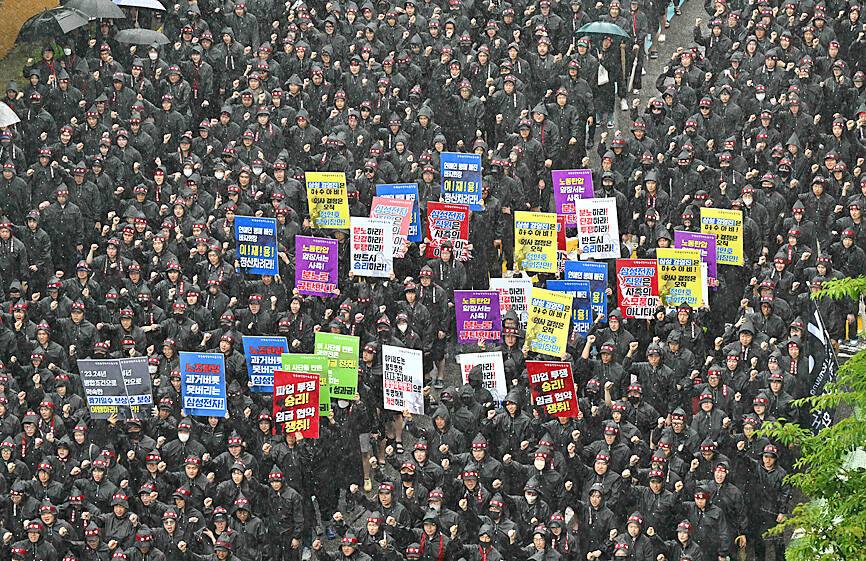 Wearing rain jackets and ribbons saying “fight with solidarity,” thousands of workers gathered outside the company’s foundry and semiconductor factory in Hwaseong, an hour south of Seoul.