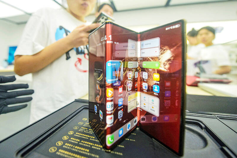 China’s Huawei Technologies Co (華為) yesterday unveiled the world’s first tri-foldable phone, as it seeks to expand its lead in the world’s biggest smartphone market and steal the spotlight from Apple Inc hours after it debuted a new iPhone.