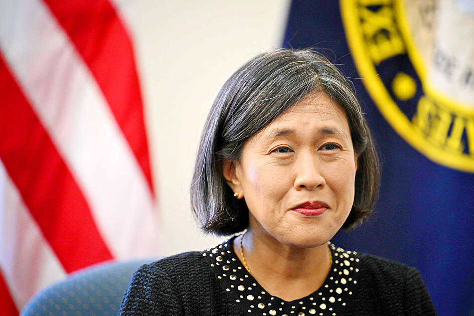 US Trade Representative Katherine Tai (戴琪) defended stiff tariff hikes against countries such as China, saying that paired with investment, they were a “legitimate and constructive” tool for reinvigorating domestic industries.
