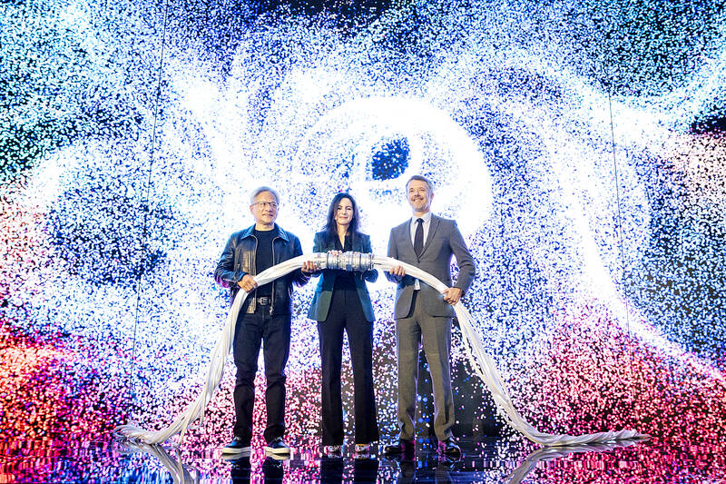 Nvidia CEO Jensen Huang, Danish Centre for AI Innovation A/S CEO Nadia Carlsten and King Frederik X of Denmark power on the supercomputer Gefion at the Vilhelm Lauritzen Terminal in Kastrup yesterday. The new AI supercomputer named Gefion, an Nvidia DGX SuperPOD, has been established in collaboration with Denmark’s Export and Investment Fund and Nvidia.