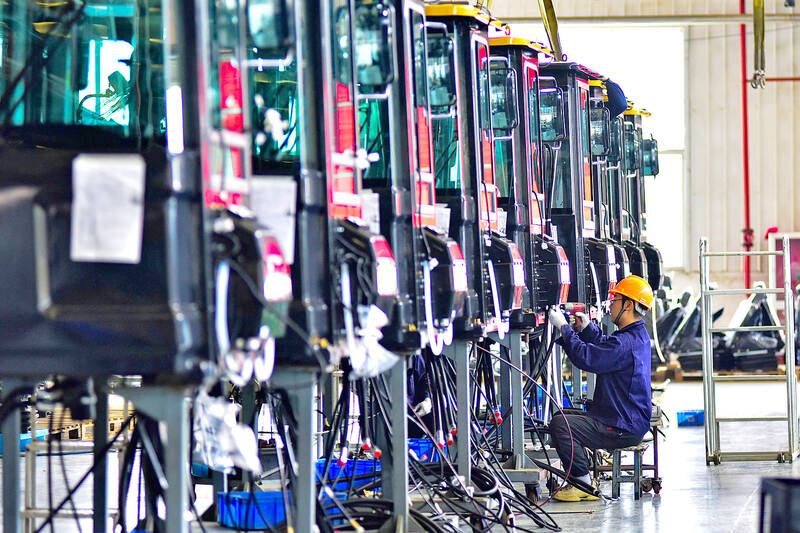 Workers build cabs for excavators at a factory in Qingzhou in China’s Shandong Province yesterday. China’s manufacturing output expanded last month for the first time since April, official data showed yesterday, rare good news for leaders struggling to boost activity in the world’s second-largest economy.