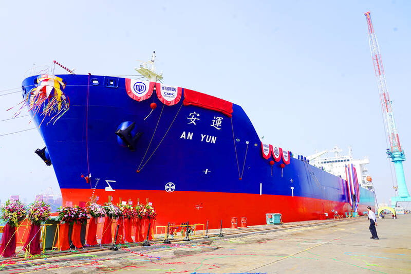 A man walks toward CPC Corp, Taiwan’s new oil and chemical tanker “An Yun” at CSBC Corp, Taiwan’s No. 2 wharf in Kaohsiung yesterday, ahead of its naming ceremony. CPC said the 50,000-tonne vessel — built by CSBC over two-and-a-half-years — would transport oil products around Taiwan to meet market demand and provide a stable supply.