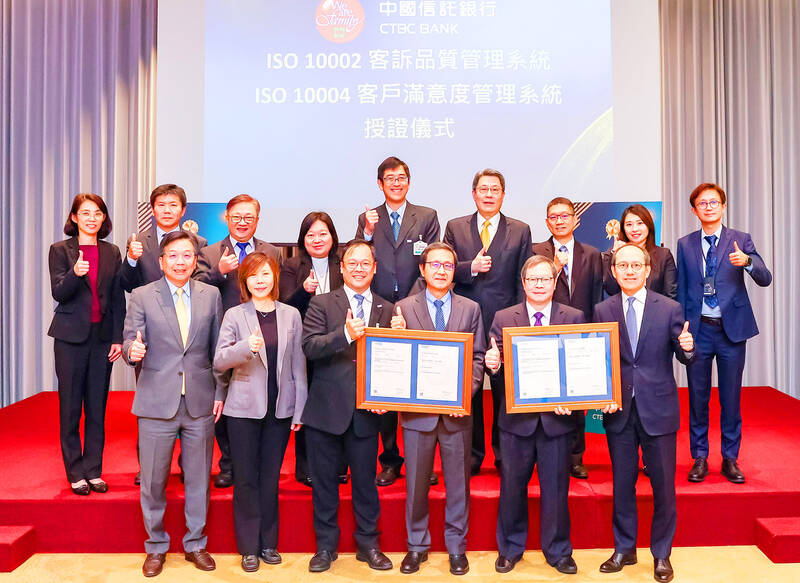 CTBC Bank (中信銀行), which has held the ISO9001 quality management system certification for many years, said on Thursday that it recently obtained ISO10002 customer complaint management system certification and ISO10004 customer satisfaction management system certification, indications of the bank’s efforts in improving financial services and enhancing customer services.
