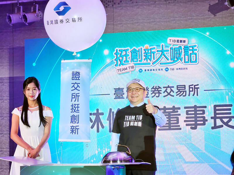 Taiwan Stock Exchange chairman Sherman Lin, right, gestures at an event yesterday after launching the upgraded Taiwan Innovation Board (TIB), which the exchange aims to develop into Asia’s premier platform for start-ups and emerging industries. Effective yesterday, the refined TIB removes restrictions on qualified investors and opens the market to retail investors, the exchange said, adding that it hopes the reform would boost market liquidity, increase accessibility and promote innovation.
