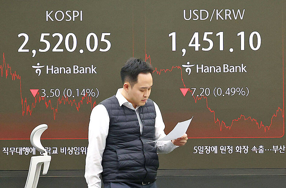The benchmark KOSPI fell 0.14 percent to close at 2,520.05 after the central bank cut its growth forecasts, while the won was trading at 1,451.7 per US dollar at 3:30pm, down 6.6 won from the previous session.